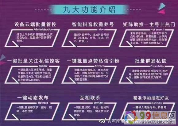 抖音智控系统,一个系统后台一键批量控制N多个抖音账号,批量点赞和评论、批量上传视频、批量圈粉丝涨人气、截留同行粉丝等功能,同时对自己关注和关注自己的粉丝进行自动私信,通过自定义内容传达自己的宣传效果,达到引流的作用。通过智控这套营销系统,帮助我们在短视频上宣传产品,打广告,做品牌,也可以助力某个视频上抖音热门,增加人气和产品曝光量,获取更多的关注度,帮助个人与企业在抖音上快速地打造百万千万粉丝量,找到更多的客户提升销量业绩。9.9.x.i.n.x.i.n.e.t